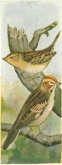 Range.—Rocky Mountains, from Colorado to Arizona, and winters in Mexico. They are much like the last, but have a patch of yellow on the rump and breast. Their nest on the ground, beside some rock or stump, is made of shreds of vines and grass. Three or four white eggs, specked and wreathed with brown (.62 × .50).