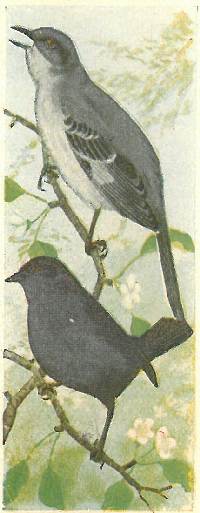 Range.—Texas to California and southward, breeding commonly from central California southward. These birds not only have a song of their own which puts them in the opera class, but, as their name implies, they can mimic or mock nearly anything in the bird line for song or bird notes. They are not satisfied with a few notes early in the morning and evening, but will keep their song in full play all day, without hardly seeming to take time to hunt up a few worms or insects, as if eating was not to be considered when he could sing.