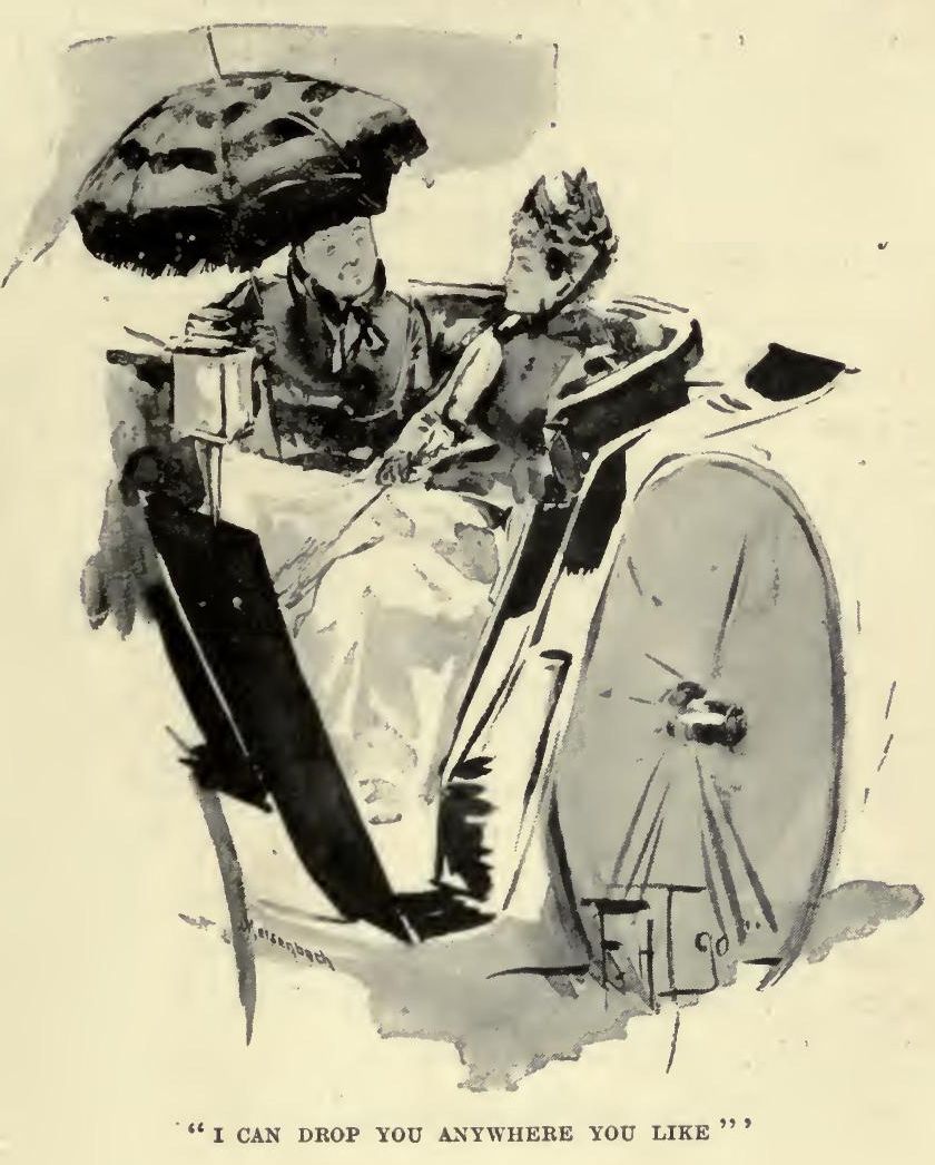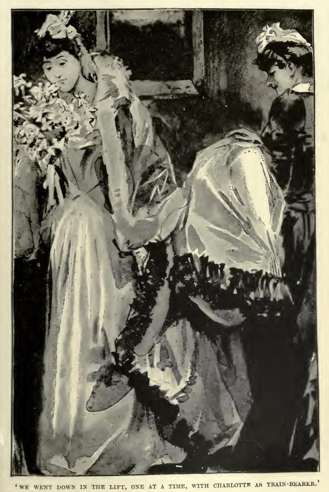 We went down in the lift one at a time, with Charlotte as train-bearer, and the other maids furtively admiring from the end of the hall. Almost everybody in Cadogan Mansions seemed to be going out at about the same time, and a small crowd had gathered on each side of the strip of carpet that led from the door to the carriage. It was Lady Mafferton's carriage, lent for the occasion, and the footman and coachman were as impressive as powder and buff and brass buttons would make them. In addition, they wore remarkable floral designs about the size and shape of a cabbage-leaf upon their breasts immediately under their chins. That was another thing that could not have been done with dignity in America.