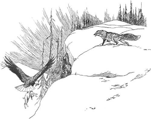 One day toward noon, when the sky was clear and the shadows of the leaves lay small and sharp, a strange, vast shadow sailed swiftly over the face of the bank, and seemed to hover for an instant. The old fox leaped to her feet with a quick note of warning. The big red puppy, superior to his brothers and sisters in caution no less than in courage, shot like a flash under the shelter of a thick juniper-bush. The others crouched where they happened to be and looked up in a kind of panic. In what seemed the same instant there was a low but terrible rushing sound overhead, and the great shadow seemed to fall out of the sky. One of the little foxes was just on top of the bank, crouching flat, and staring upward in terrified amazement. The mother, well understanding the fate that impended, sprang toward him with a screeching howl, hoping to frighten away the marauder. But the great goshawk was not one to be scared by noise. There was a light blow, a throttled yelp, a sudden soundless spread of wide wings, then a heavy flapping; and just as the frantic mother arrived upon the spot the huge bird sprang into the air, bearing a little, limp, red form in the clutch of his talons. [36] When he was gone the rest of the puppies ran shivering to their mother,—all but Red Fox himself, who continued to stare thoughtfully from the covert of his juniper-bush for some minutes. For a long time after that experience he never failed to keep a sharp watch upon the vast blue spaces overhead, which looked so harmless, yet held such appalling shapes of doom.