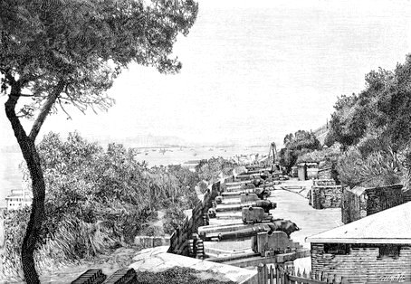 But as I have just now more freshly in mind the English history of Gibraltar, I leave the Spaniards and the Moors, and betake me to the King's Bastion, on which "Old Eliott" stood on the greatest day that Gibraltar ever saw. And here we must not forget the second in command, his brave companion-in-arms, General Boyd, who built the Bastion in 1773, and who, on laying the first stone, prayed "that he might live to see it resist the united fleets of France and Spain"—a wish that was gloriously fulfilled nine years later, when he took part in the immortal defence; and it is fitting that his body should sleep under his own work, at once the instrument and the monument of that great victory. Even the trees have a historic air, as they are old—at least many of them have a look of age. One would think that the constant firing of guns, the shock and "sulphurous canopy," would kill vegetation or stunt it in its growth. But there are many fine old trees in Gibraltar. Near the Alameda stands a magnificent bella sombra (so named because its wide-spreading branches are dark and sombre, and yet strangely beautiful), which must be very old. Perhaps it was standing a century ago, and heard all the guns fired in the Great Siege, as possibly a few years later it may have heard, across the bay and away over the Spanish hills, even the thunder of Nelson at Trafalgar.
