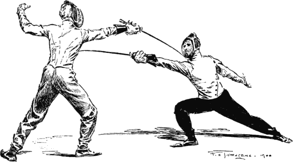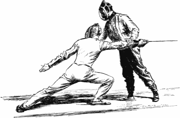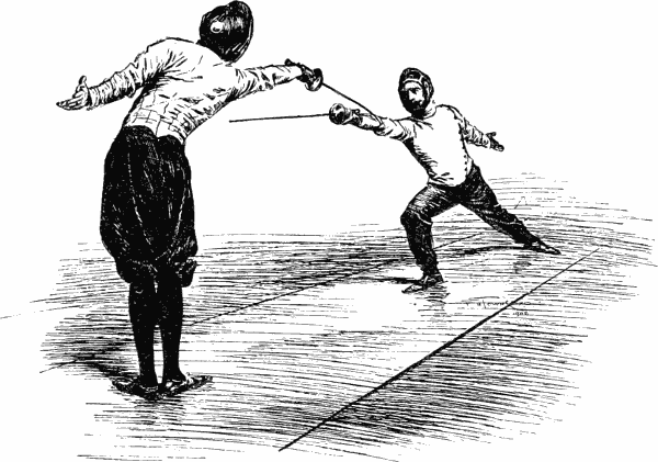 “Of course,” I replied, “you will understand that I have no intention of inflicting upon you a course of instruction. As far as that goes, the books, especially the two that have appeared most recently, by Professors Gomard and Grisier, have said all that is worth saying, and in my[Pg 18] judgment perhaps a great deal more. They give too much good advice, too many excellent rules, too many excellent maxims, too many thrusts, feints, parries, ripostes, counter-ripostes, and so forth.