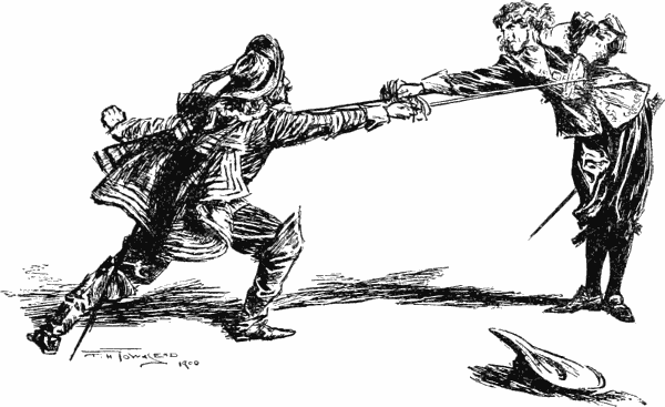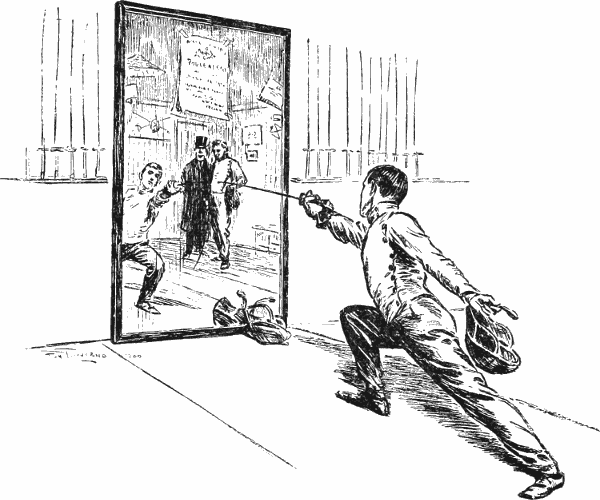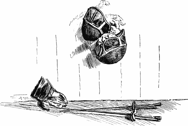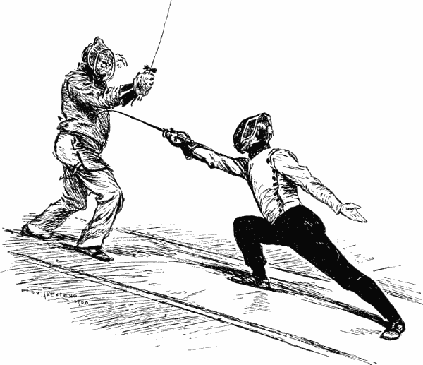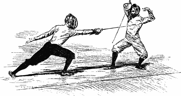 “Remember that a sword-thrust, even though[Pg 245] it be mortal, does not take effect immediately. There is always a momentary interval before the wounded man falters, or drops his sword, or falls to the ground unconscious. The moment you think you have made a hit,—for you may be mistaken,—get back as smartly as you can, and be ready to go on fighting.