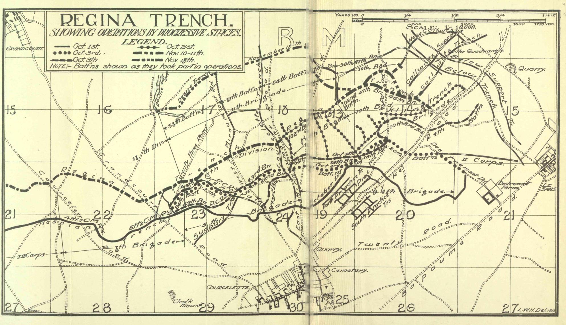 At midnight 10th-11th, the 10th and 11th Brigades attack and capture the German portion of Regina Trench to Farmer Road. All objectives gained, though the 102nd Battalion, in the northern attack, unable to maintain a post as far north of Regina as had been hoped. A very successful attack—the positions consolidated by 3 a.m. and later several counter-attacks beaten off. The 12th Brigade relieve the 10th and 11th Brigades in the new line.