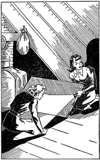“See this little worn place, with the wood that gives a little? There is a spring under that and it lets down things or brings them up again, perhaps.”