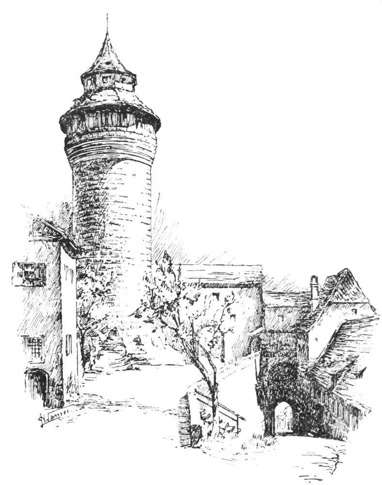 YEAR by year, many a traveller on his way to Bayreuth, many a seeker after health at German baths, many an artist and lover of the old world, finds his way to Nuremberg. It is impossible to suppose that such any one is ever disappointed. For in spite of all changes, and in spite of the disfigurements of modern industry, Nuremberg is and will remain a mediæval city, a city of history and legend, a city of the soul. She is like Venice in this, as in not a little of her history, that she exercises an indefinable fascination over our hearts no less than over our intellects. The subtle flavour of mediæval towns may be likened to that of those rare old ports which are said to taste of the grave; a flavour indefinable, exquisite. Rothenburg has it: and it is with Rothenburg, that little gem of mediævalism, that Nuremberg is likely to be compared in the mind of the modern wanderer in Franconia. But though Rothenburg may surpass her greater neighbour in the perfect harmony and in the picturesqueness of her red-tiled houses and well-preserved fortifications, in interest at{2} any rate she must yield to the heroine of this story. For, apart from the beauty which Nuremberg owes to the wonderful grouping of her red roofs and ancient castle, her coronet of antique towers, her Gothic churches and Renaissance buildings or brown riverside houses dipping into the mud-coloured Pegnitz, she rejoices in treasures of art and architecture and in the possession of a splendid history such as Rothenburg cannot boast. To those who know something of her story Nuremberg brings the subtle charm of association. Whilst appealing to our memories by the grandeur of her historic past, and to our imaginations by the work and tradition of her mighty dead, she appeals also to our senses with the rare magic of her personal beauty, if one may so call it. In that triple appeal lies the fascination of Nuremberg. For this reason one may hope to add to the enjoyment of those who may spend or have spent a few days in the “quaint old town of toil and traffic, quaint old town of art and song,” by recounting the tale of her treasures, and by telling, however imperfectly, something of the story of her rise and fall, and of the artists whom she cradled. Many shall go to and fro and their knowledge shall be increased. Is not that the justification of a guide-book?