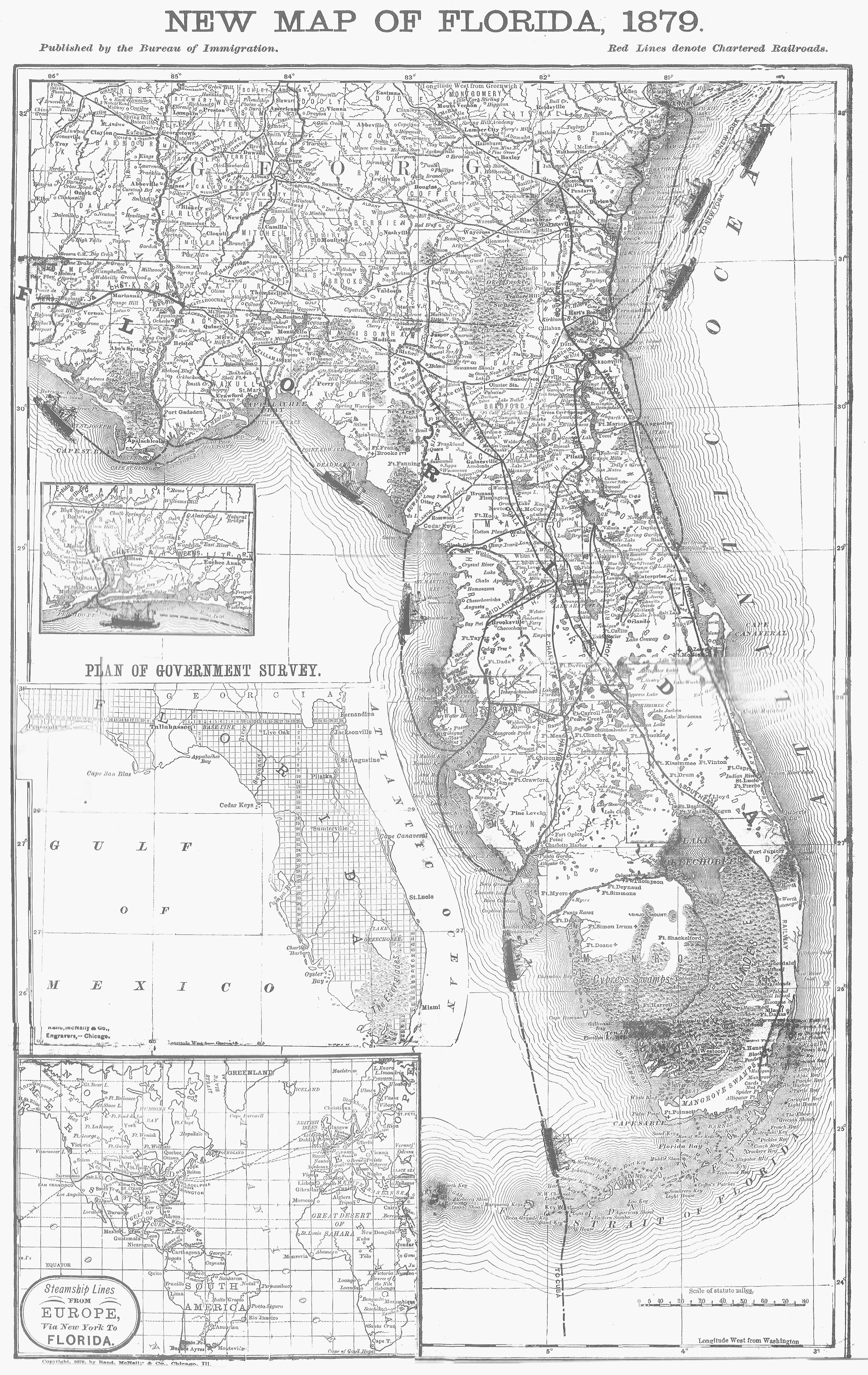 | From Jacksonville to Cedar Keys—The Florida Central—Baldwin—Alligators and moccasins—West India Transfer Railroad—Piney Woods—Trail Ridge—Lawtey—Starke—Turpentine distillery—Serenades—Waldo—Alachua county—Hummock-lands and phosphates—The indignant Boston lady—Alachua settled in 1750 by an Indian named Secoffe—Juggs or sinks—Approach to Gainesville—This town named for General E. P. Gaines—Accommodations for visitors—Tillandsia and its uses—Orange Lake the natural home of the orange—Budded trees—Eucalyptus-tree for malarial districts—Information on the subject of lands—Orange City, Arredondo, Albion, and other prospective cities—Bronson—Its good settlers—Otter Creek—“Great Gulf Hummock”—Its tropical growth. | |