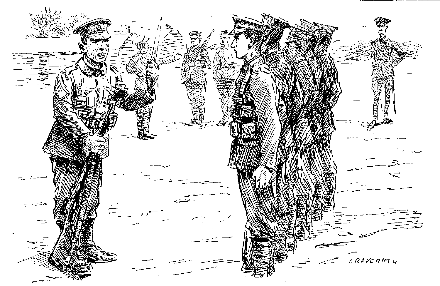 Rogers was across the table. I could see him fiddling with knives and salt-cellars. All at once he broke out: "In our platoon to-day there was a man missing, and in consequence a blank file. Now in such a case——"
