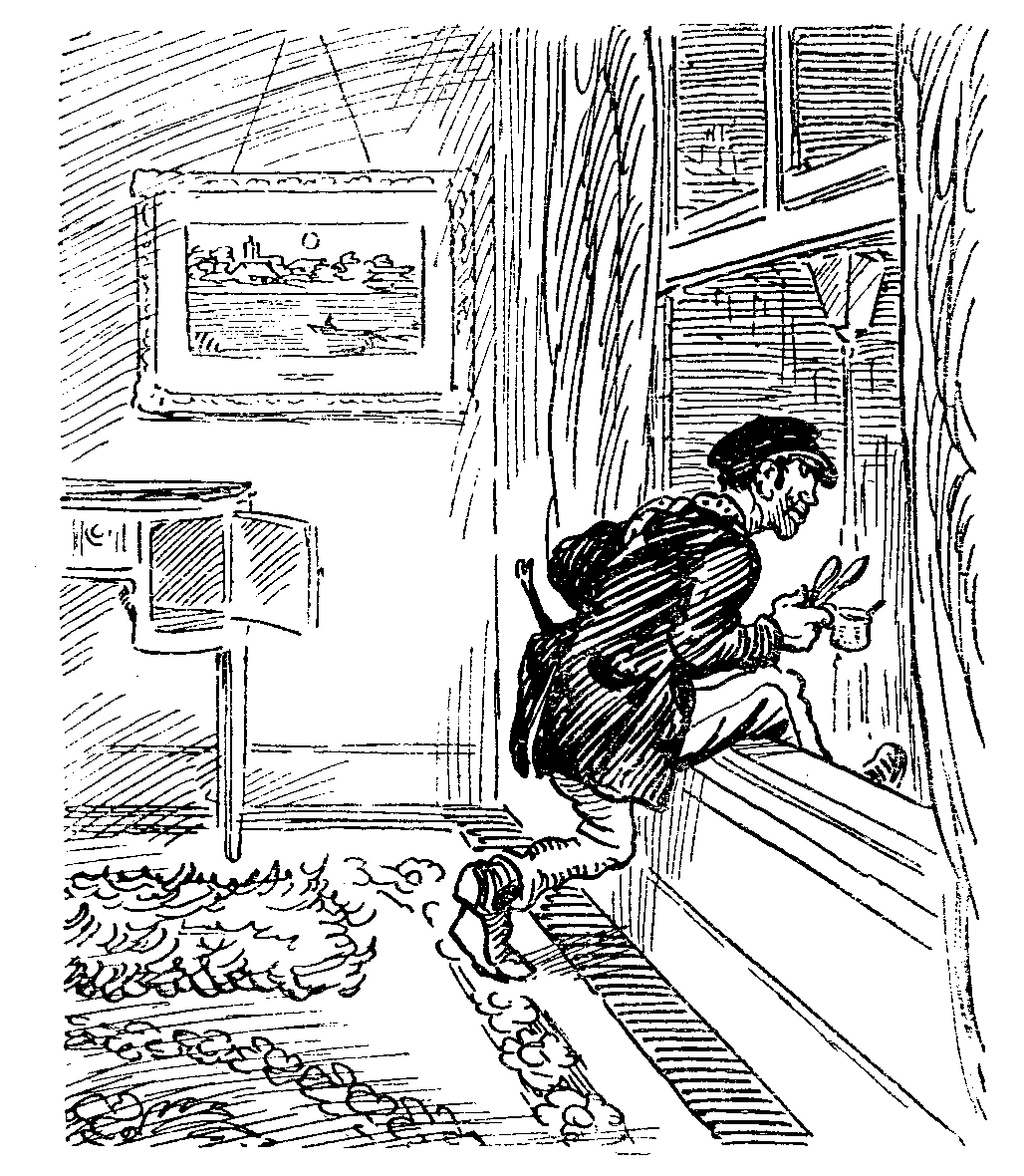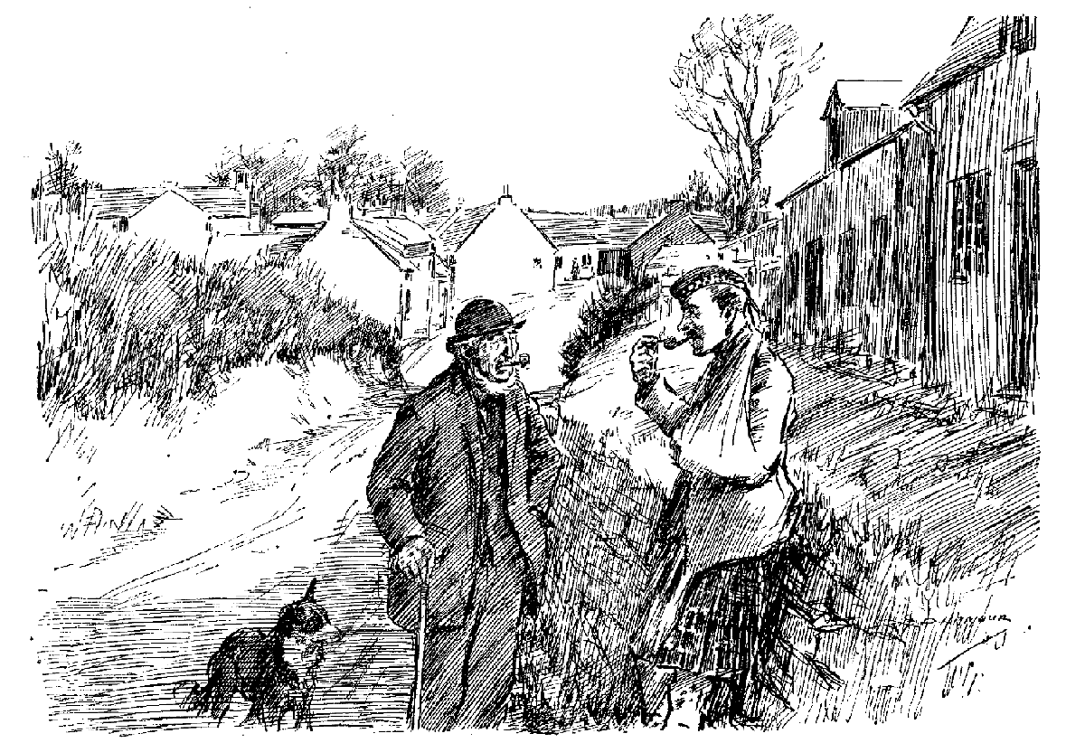 The very day we came away I met the millionaire man. It was a wild wet day, and I was draining in an alcove underneath the promenade when he appeared. He didn't look rich, and he was running and panting and glancing over his shoulder in a hunted manner. No sooner did he see me than he whispered, "Blimy, 'ere's a chance! Good dawg, then—'old yer 'ed up," and at once crammed a heap of "goblins" (Mabel's word) and lots of crackley paper into my box. He followed this up with about two yards of shiny chain and things that winked so that I had to wink as well. Then came lots of things like goblins with their middles bitten out; and hardly had he given me the last before two monstrous men in blue rushed round the corner. I don't remember exactly what happened, but the millionaire man said, Blimy, couldn't he run after his hat wot the wind blown off? and the blue men said why, yes he could, but they were sure he hadn't. Then he said, Blimy, they could "turn him over," straight they could, and they said straight they would. But they didn't. Instead they felt in all his pockets, and only found a clay pipe and some cheese wrapped up in newspaper. Then things became so uninteresting that I sauntered back to Mabel.