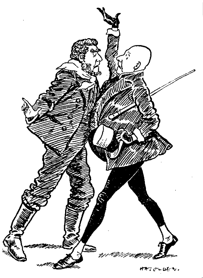 Sir Herbert Tree (as Dan'l Peggotty) to Sir Herbert Tree (as Micawber). "Theer, I zed 'twould happen zo one of these vine days. You've turned up too zoon!"