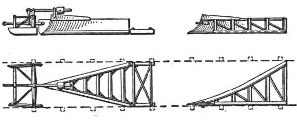 The first machines built were of the second type. As now constructed they are mounted on a wide wooden frame or car body, supported by four small wheels of 7 ft. to 8 ft. gage, thus placing the machinery close to the ground, with a wide base of support. In transporting this machine from one place to another, not on the line of a railway, it is necessary to take it apart, forward the sections and put them together again at the site of the new work. The machine is built with a view to rapid dismantling and re-erection, and for work requiring a large machine for economical excavation, located in hilly country not yet made accessible by rail, or requiring transportation by boat, it is the machine most generally used. Its ready adaptability to all kinds of work in any location has made it the favorite machine with many general contractors whose work includes large contracts for railway and other excavation. For transportation by rail this machine is run onto an ordinary flat car, only the crane being detached and loaded on a separate car. With this manner of shipment the machine can be made ready for railway work very quickly, but for exclusive railway work[5] a machine of a later design has come into use and is now generally preferred for this class of work.