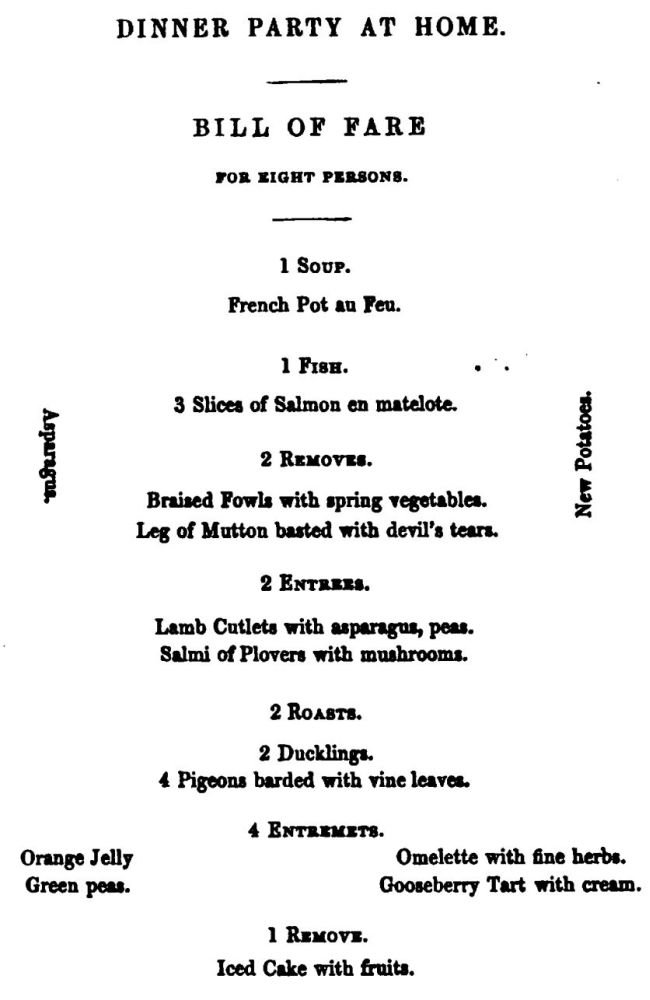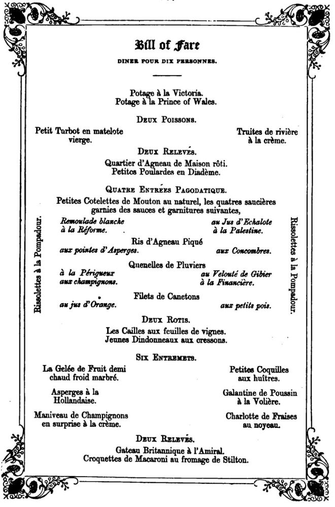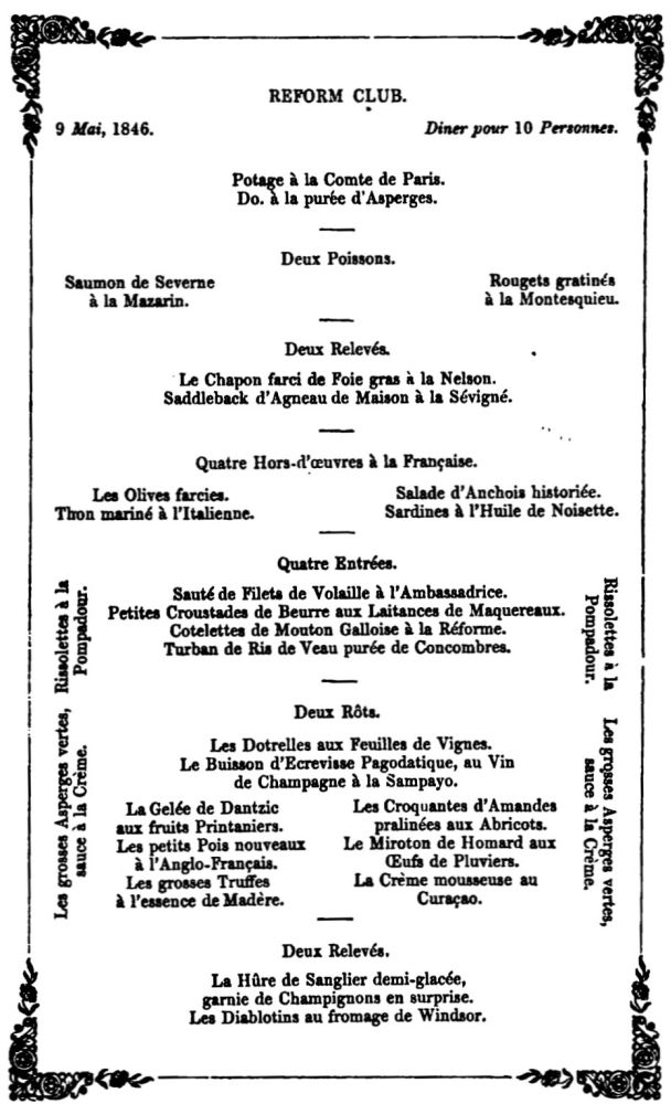 I shall also remark that my motive in not making a translation to my index, but merely naming at the commencement of each series the different comestibles, is to avoid the following ridiculous occurrence,{xiii} that is, the making of bills of fare in English from such curious translation, not one of which have I seen deserving publication, being composed of comic French trivialité.