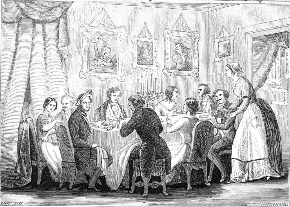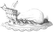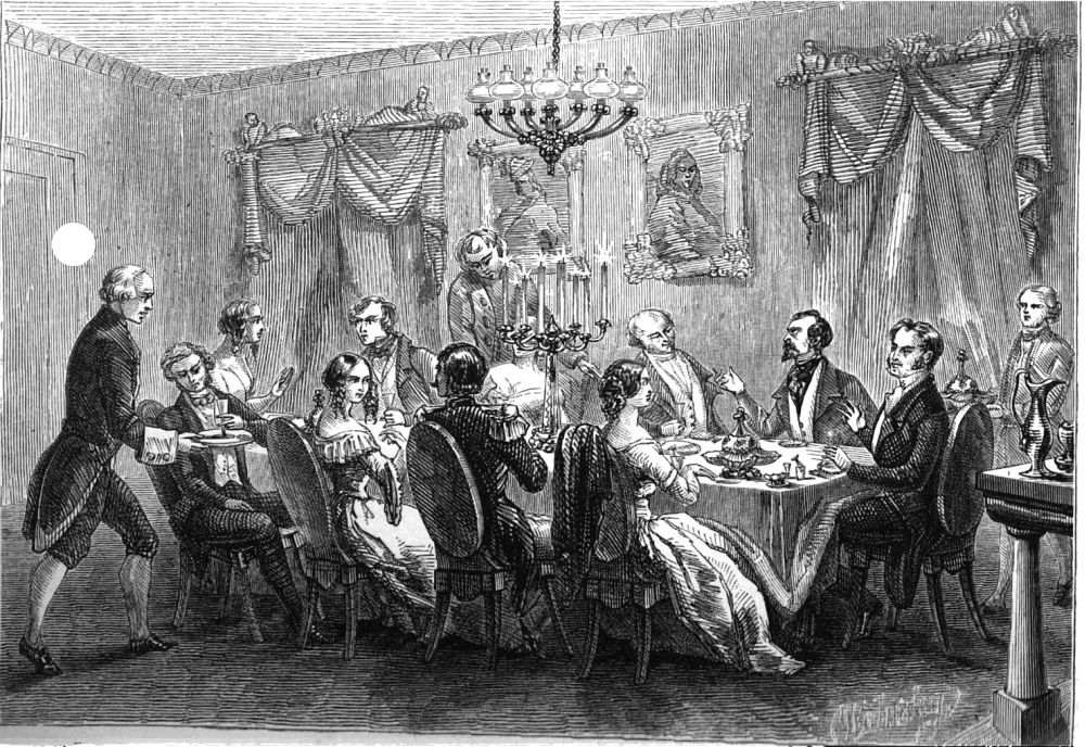 Amongst other tribulations of carving I shall relate a most boufonne anecdote. “If you should, unhappily, be forced to carve at table,” says Launcelot Sturgeon, in his Essays, Moral, Philosophical, and Stomachic, “neither labour at the joint until you put yourself into a heat, nor make such a desperate effort to dissect it as may put your neighbours in fear of their lives; however, if any accident should happen, make no excuses, for they are only an acknowledgment of awkwardness.{xv} We remember to have seen a man of high fashion deposit a turkey in this way in the lap of a lady, but with admirable composure, and without offering the slightest apology, he finished a story which he was telling at the same time, and then, quietly turning to her, merely said, ‘Madam, I’ll thank you for that turkey.’” My conscience will not allow me to swear to the authenticity of the fact, but in the course of twelve months past I have witnessed a very similar instance, only the party not possessing the assurance of the fashionable above mentioned, did not continue the conversation, but in his nervous anxiety, endeavouring to replace it on the dish with vivacity, sent it rolling across the table to his right-hand neighbour, who quickly perceiving the imminent danger in which he was placed, fortunately arrested its further progress with his fork. One hearty laugh of the remaining party terminated this scene of confusion.