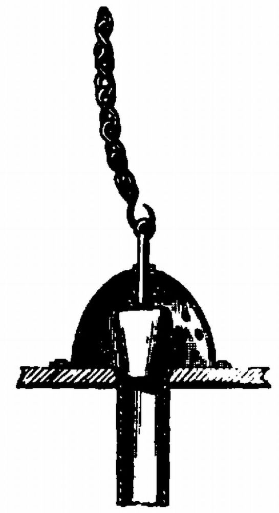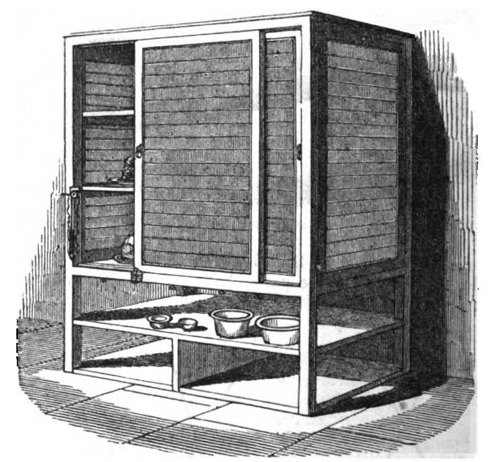 To give our readers an idea of the completeness of this Marine Miniature Kitchen, they will be surprised when we say that in a confined space of seventeen feet long and eight wide, a range with vertical bars, smoke-jack, screen, spits and dripping pan are erected, where roasting may be done in great perfection: next is a bain-marie, for keeping soups and sauces very{784} hot, without the danger of burning or of being upset in rough weather: three charcoal stoves, hot plate, gridiron; and a steam boiler for dressing vegetables, and even meat or fish, is found to be a very great convenience. There is also a good oven for baking bread, pastry, and biscuits, and a hot closet above; a kitchen table, with drawers and sliding shelves, under which is a cupboard for preserves, a pestle and mortar, vegetable and washing boxes; under the stove and hot plate are two recesses for fuel; above the stoves are placed rows of shelves, upon which blocks of wood are fixed for each saucepan; on the edges of the shelves the sauté pans, covers, and ladles are suspended, and secured with bands of India rubber to prevent the rattling: in fact a complete ‘batterie de cuisine’ is at the disposal of the cook; and the last but not the least ingenious design is a moveable balance grating, with something new in its contrivance, as it prevents the upsetting of any saucepans used upon it in stormy weather. Two perpendicular pieces of iron of about fifteen inches are fixed into a circle, the size of the charcoal stove, at the extreme points of the square, where pins of iron are fixed to keep the circle in its place; between the two uprights is the grating, supported by two rods on each side, finishing in a point, and turning at the end like a hook, to go into the holes perforated at the top of the uprights, thus acting like the compass, the saucepans are thus always on a level; and by merely turning the circle to whatever point is required, this balance grating will support its burthen over the fire constantly on a level, despite the rolling of the vessel. Outside, leading to the deck, are rows of hooks covered over to hang up meat, game, and poultry. In fact, the whole of the fittings are so contrived that they have the appearance of fixture.