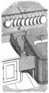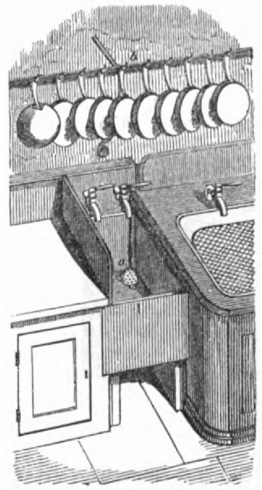For a kitchen in a vessel of less dimension, one steam pan, the hot plate and oven would be sufficient, and only a few of the useful articles mentioned would be required, thereby considerably diminishing the expense, and then possess a kitchen very superior to those now constructed.{785}