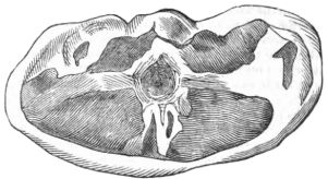 When I am called to carve a haunch of venison for eighteen or twenty I proceed as follows: I take off the flat bone, previous to roasting, at the back of the loin, and pass the knife from the knuckle all along the lower part of the flap, which is left about two inches wide; I then begin to cut in a slanting direction, as the drawing represents, from the beginning of the loin, through the leg as far as the knuckle, without reserving a well for gravy, and in fact I have found it to be better, as every slice you cut through the leg produces its own gravy boiling hot, which unavoidably gets cold in the well formed the other way of carving. Do not omit to save some fat for the next day, as your hash or pie would be insipid.