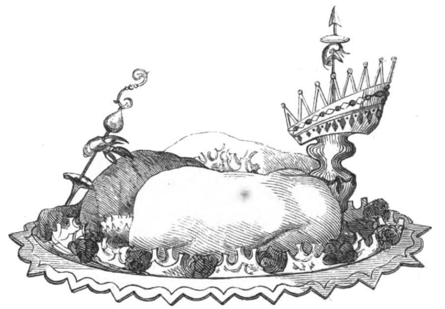 [9] The flesh of the wild boar being rather difficult to obtain in this country, the head being the only part considered worth presenting, the flesh of the common pig may be used for the forcemeat and interior, as well as the rind, which must be selected in pieces as large as possible; a bottle of common port wine is an improvement in the pickling.