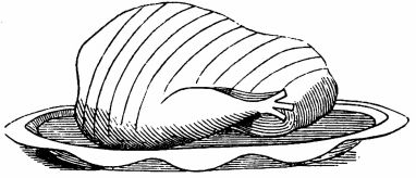 By the simple process which I have effected for the jointing of game or small poultry, with a long pointed pair of scissors, separating the sinews which join the wings to the breast, making the incision as small as possible, and also jointing the legs, by passing your finger between the skin and the flesh, pressing the legs over the breast with the left hand, the separation of the joints may be easily effected and having thus detached the four principal parts, the carving, when roasted, will be very simple. But for the jointing of large birds, as turkeys, geese, capons, &c., procure an instrument I invented for that purpose from Bramah’s, Piccadilly, with which a very intelligible printed direction will be given for its use; after having jointed the bird, truss it with a packing-needle and string, as usual, but not pressing them so tightly, or they would become deformed, whilst, on the contrary, if merely brought to their usual shape, they will look as plump as possible, and the process they have previously undergone will be totally imperceptible. In many instances where I have sent poultry to table thus previously jointed, the parties carving have been quite surprised at their unexpected progress in that difficult art. Formerly nothing was more difficult to carve than wild fowl, the continual motion (when alive) of the wings and legs making the sinews almost as tough as wires, puzzling{xvi} the best of carvers to separate them; my new method has quite abolished such a domestic tribulation. A long and dry description for the carving of each bird separately would be entirely useless, as every one of my readers will have perceived that almost the whole difficulty is defeated by this simple process; I shall therefore leave the subject, making but the following observation, which is, that in everything I dislike a straight line, and still more so in carving any kind of bird, by doing which you not only spoil their appearance, but cut against the grain, causing them to eat dry and, imperceptibly, obliging you to assist some of the guests to very thick pieces, unless the breast is very full and plump. I have here given a simple woodcut of a small turkey, by which you will easily perceive, that by trussing and carving in my new way, as represented, you will be enabled to carve for more people, assisting each to better slices with a middling-sized fowl, or any other bird, than with a larger one trussed and carved in the usual method. Keep, if possible, the legs in the position indicated in the design; any small birds, such as woodcocks, plovers, snipes, or teal, are generally cut into two or four, being easily carved, but for anything above their size the foregoing plan had better be acted upon.