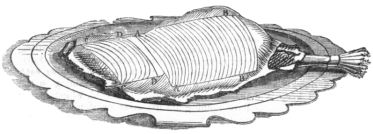 The above engraving represents a haunch of venison, cooked as No. 540, and ready for carving, the back-bone of the loin being first partly taken out to facilitate the operation, as marked by letters and lines in the drawing. The carving-knife must be sharp; put the point of it an inch deep from letter A to B, and draw it in a slanting direction from letter A to A, so on from B to B, but go a little deeper in, according to the thickness of your haunch, and avoid making a hole through any part of it, as a well must be reserved to give half a spoonful of gravy to every plate, each of two thin slices. If you are to help more than eight or ten persons from the haunch, then carve{xix} the loin at the same time as the thickest part, from C C to D D, and give to each guest a slice from each part, by which you will quickly perceive that you have fairly cut the meat, and that each person will have had his proper quantity of fat, and from first to last each slice will be very inviting; serve on very hot plates of silver if possible. Every amateur of venison knows, that without its due quantity of fat it is hardly eatable; I would therefore advise those who still wish to carve haunches on the old system, to calculate how many plates they have to carve for, otherwise they are sure to be misled, if they do not take the trouble to ascertain the number who are to be helped. My new system possesses an advantage, which is, that if six or eight persons only partake of a haunch, the remains of it are in a fine state, and fit to be cut into large slices for another dinner, by merely putting a few spoonfuls of gravy with the slices into a sautépan, over a sharp fire for three minutes; turn them carefully, season with little salt, a teaspoonful of currant jelly, turn the slices two or three times over until the jelly is dissolved, serve on a very hot dish, but be careful not to let the slices boil in the pan, or else they will become very tough. If any remain, make a hash as No. 784, or pie, No. 785.