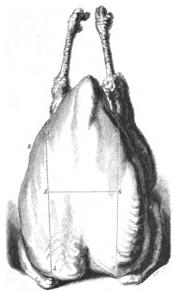 After a short consideration I found, by a most simple rule, and with the greatest facility, that a bird that would take ten minutes to carve very badly may be done well in two or three by the most inexperienced person. From this process a number of advantages may be derived: first, you may eat your dinner much hotter; secondly, you can make eight or ten pieces of a fowl, or any other bird, where, previously, great difficulty was experienced in making five or six; and each person will thereby be enabled to choose a favorite piece; a large bird, such as turkey, poularde, capon, &c., will be fit to reappear on your table in a very inviting state. I must also observe that the birds are not in the least disfigured, but, on the contrary, their appearance is much improved.
