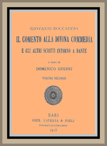 «Intanto voce fu». Dissi qui cominciare la seconda parte della seconda principale, nella qual mostra Virgilio essere stato da quattro poeti onoratamente ricevuto; e dice: «Intanto», cioè mentre Virgilio mi rispondeva alla domanda fatta, come di sopra appare, «voce». A differenza del suono, è la voce propriamente dellʼuomo, in quanto esprime il concetto della mente, quando è prolata; ogni altra cosa per la bocca dellʼuomo, o dʼalcun altro animale, o di qualunque altra cosa, è [o] suono [o sufolo]: e questi suoni hanno diversi nomi, secondo la diversitá delle cose dalle quali nascono. «Fu per me», cioè da me, «udita», cosí fatta:—«Onorate lʼaltissimo poeta»; e questa, per quello che poi segue, mostra che detta fosse, da chi che se la dicesse, a quegli quattro poeti che poi incontro gli si fecero. Ed assai onora qui Dante Virgilio in quanto dice «altissimo», il quale adiettivo degnamente si confá a Virgilio, percioché egli di gran lunga trapassò in iscienza ed in arte ogni latin poeta, stato davanti da lui, o che poi per infino a questo tempo stato sia. «Lʼombra sua», cioè di Virgilio, «torna, chʼera dipartita»,—quando andò al soccorso dellʼautore, come di sopra è dimostrato.