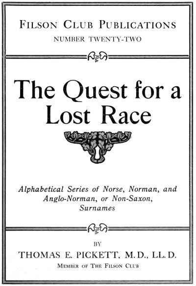 While the Home-Coming Kentuckians were enjoying their meeting, in Louisville, in the month of June, 1906, Doctor Thomas E. Pickett published a newspaper article which he had written for the Home-Coming Week, the object of which was to present the theory of Paul B. Du Chaillu as to the descent of the English-speaking people from the Scandinavians instead of the Teutons; and to show that the descendants of these Scandinavians were still existing in different countries, and especially in Kentucky. The author sent me a copy of his article, and after reading it I deemed it an ethnological paper worthy of a more certain and enduring preservation than a daily newspaper could promise, and concluded that it would be suitable for one of the publications of The Filson Club. I wrote to the author about it, and suggested that if he could enlarge it enough to make one of the annual publications of the Club, of the usual number of pages, and have it ready in time, it might be issued for the Club publication of 1907. The author did as I suggested, and the book to which this is intended as an introduction is number twenty[Pg viii]two of The Filson Club publications, entitled "The Quest for a Lost Race," by Thomas E. Pickett, M. D., LL. D., member of The Filson Club.