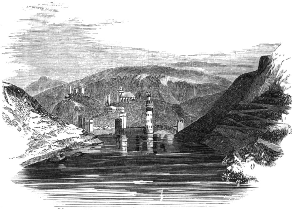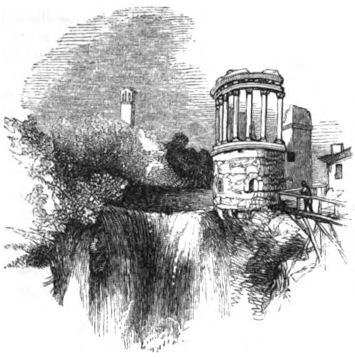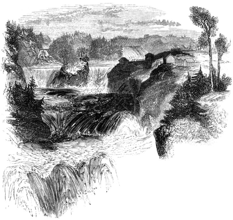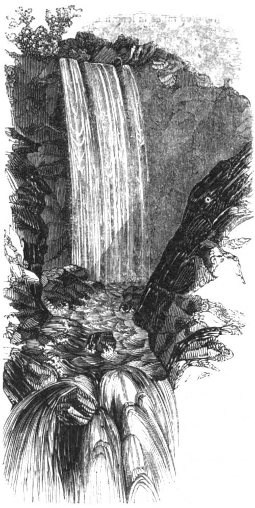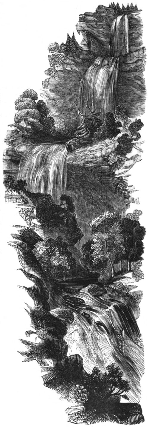In the grandeur of their cataracts, also, the American rivers far surpass those of other countries, though several falls on the ancient continent have a greater perpendicular height, and are magnificent objects. In Sweden, the Gotha falls about 130 feet at Trolhetta, the greatest fall in Europe of the same body of water. The river is the only outlet of a lake, a hundred miles in length and fifty in breadth, which receives no fewer than twenty-four rivers; the water glides smoothly on, increasing in rapidity, but quite unruffled, until it reaches the verge of the precipice; it then darts over it in one broad sheet, which is broken by some jutting rocks, after a descent of about forty feet. Here begins a spectacle of great grandeur. The moving mass is tossed from rock to rock, now heaving itself up in yellow foam, now boiling and tossing in huge eddies, growing whiter and whiter in its descent, till completely fretted into one beautiful sea of snowy froth, the spray, rising in dense clouds, hides the abyss into which the torrent dashes; but when momentarily cleared away by the wind, a dreadful gulf is revealed, which the eye cannot fathom. Upon the arrival of a visitor at Trolhetta, a log of wood is sent down the fall, by persons who expect a trifle for the exhibition. It displays the resistless power of the element. The log, which is of gigantic dimensions, is tossed like a feather upon the surface of the water, and is borne to the foot almost in an instant. In Scotland, the falls of its rivers are seldom of great size; but the rocky beds over which they roar and dash in foam and spray—the dark, precipitous glens into which they rush—and the frequent wildness of the whole scenery around, are compensating features. The most remarkable instances are the Upper and Lower Falls of Foyers, near Loch Ness. At the upper fall, the river precipitates itself, at three leaps, down as many precipices, whose united depth is about 200 feet; but, at the lower, it makes a descent at once of 212 feet, and, after heavy rains, exhibits a grand appearance. The fall of the Rhine at Schaffhausen is only 70 feet; but the great mass of its waters, 450 feet in breadth, gives it an imposing character. The Teverone, near Tivoli, a comparatively small stream, is precipitated nearly 100 feet; and the Velino, near Terni, falls 300, which is generally considered the finest of the European cataracts. This “hell of waters,” as Byron calls it, is of artificial construction. A channel was dug by the Consul Carius Dentatus in the year 274 B. C., to convey the waters to the precipice, but having become filled up by a deposition of calcareous matter, it was widened and deepened by order of Pope Paul IV. “I saw,” says Byron, “the Cascata del Marmore of Terni twice at different periods; once from the summit of the precipice, and again from the valley below. The lower view is far to be preferred, if the traveler has time for one only; but in any point of view, either from above or below, it is worth all the cascades and torrents of Switzerland put together.”