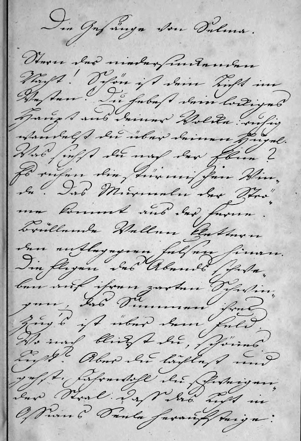Tritt, o Mond! hervor hinter deiner Wolcke; Sterne der Nacht erscheint. Ist denn kein Licht das mich führe zum Platz wo mein Liebster ausruht von der Mühe der Jagd! Sein Bogen neben ihm ohngespannt. Seine Hunde schnobend um ihn her. Aber hier muss ich allein sitzen an dem Felsen des mosigen Stroms. Und der Strom und der Wind sausst, und ich kann nicht hören die Stimme meines Geliebten.