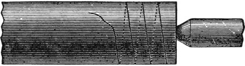 A very convenient tool for inlaying veneers edgewise, so as to produce alternate dark and white lines is made by taking a piece of steel, one fourth of an inch by one sixteenth thick, and making a chisel, like Fig. 73. The bottom is rounded to prevent it from digging in. To use this tool, or to inlay fine white and black lines, or white lines alone, all over the surface of any piece of wood in any pattern desired, it is only needful to mark out the pattern first, incise it all around with a sharp keen edge, such as a knife blade broken off to form a square end, and then follow the lines with this tool, when the wood will come away, leaving a clean channel, in which the veneer may be inserted with expedition and neatness. In crossing the corners, it is necessary to use caution, so that they be not broken away, for no inlaying looks well if chipped, or ragged at the edges. This is especially convenient for drawing lines across mahogany boxes that have been put together before inlaying was thought of for them. The veneers should all be glued together, side and side first, that is, if two colors are used, then they will fit on the ends properly, and may be handled with more expedition.