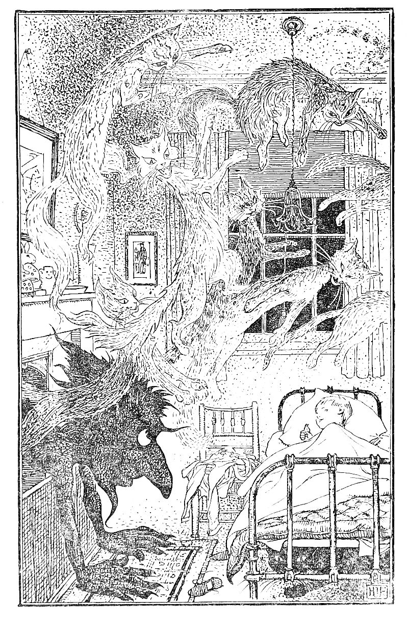 The passage into which the blue door opened was very like the nursery passage at home, and it was certainly night, because the flame-cats were dancing on the walls, which only happened after dark. Yet there was no fire burning anywhere, which was rather puzzling, but soon David saw that these were real cats, not just the sort of unreal ones which demanded a fire to make them dance at all. Some were red, some were yellow, some were emerald green with purple patches, and instead of having a band or a piano to dance to, they all squealed and purred and growled, making such a noise that David could not hear himself speak. So he stamped his foot and said ‘Shoo!’ at which the dance suddenly came to an end, and all the cats sat down, put one hind-leg in the air, and began licking themselves.