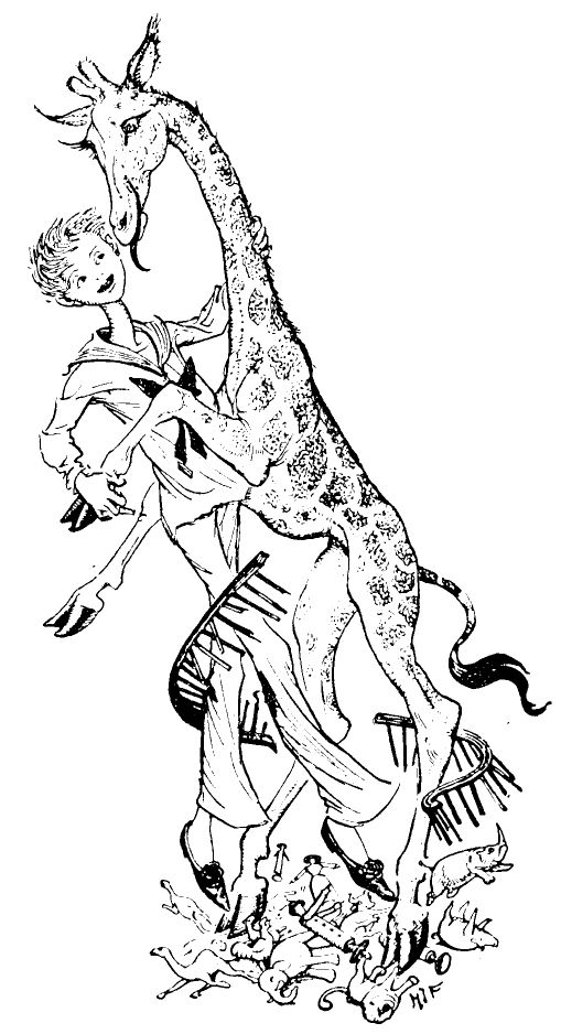 At that moment the cow’s head crashed into the wall below the window. Miss Muffet gave one faint scream, and said, ‘Spider, dear!’ Miss Bones whirled her ox-tail round her head like a sling, and, intending to hit the cow, hit Noah the most awful slap on his false whiskers, which fell off. The giraffe’s head went up the chimney with a pop and a shower of soot descended into the room.