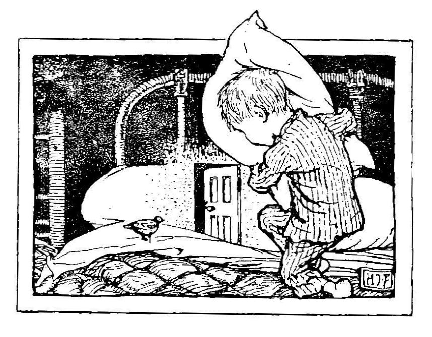 Then one night he had a clue. He had just lain down in his bed, when he heard a door beginning to behave as doors do when they think they are quite alone, and nobody is looking. Then, as you know, they unlatch themselves, and begin walking to and fro on their hinges, hitting themselves against their frames. This often happened to the nursery door when he came downstairs in the morning, after he was quite sure he had shut it. His mother therefore sent him up to shut it again, and sure enough the door was always open, having undone itself to go for a walk on its hinges. But on this night he thought that the sound of the door came from under his pillow, but he very carelessly fell asleep just as he was listening in order to make sure, and the next thing he knew was that Nannie was telling him it was morning. Again, on the very next night he had only just put his head on the pillow when the door began banging. It sounded muffled, and there was no doubt this time that it came from under his pillow. He sat up in bed, broad awake, and pulled his pillow away. By the light of the flame-cats who were dancing to-night, he could see the smooth white surface of his bolster, but, alas, there was no door there.