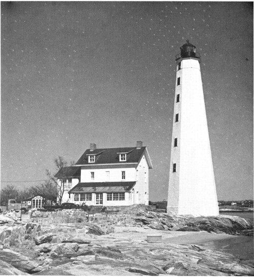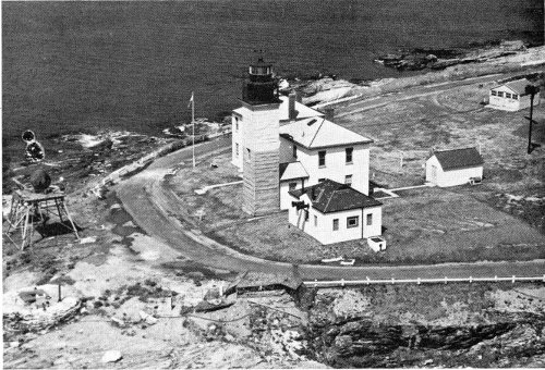 On the south end of Conanicut Island. Beavertail Lighthouse was the third lighthouse to be built in what is now the United States, the original tower having been constructed in 1749. Its erection was authorized as early as 1738 by the General Assembly of the Governor and Company of the English Colony of Rhode Island and Providence Plantation; but nothing was then done because of war breaking out between England and Spain. The first lighthouse has now been gone for nearly a century, but there stands in its place a more sturdy structure, built of granite, which was built in 1856. Almost from its first erection, Beavertail has been a sort of proving ground for various types of signaling equipment, many of which were here first tried out. One of the most curious of these was an early air-operated fog signal, for which a horse was kept on hand for the purpose of operating the air compressor. At the present time Beavertail is equipped with an electric lamp set inside a fourth-order lens. It also has a compressed-air-operated siren. (1) (2)