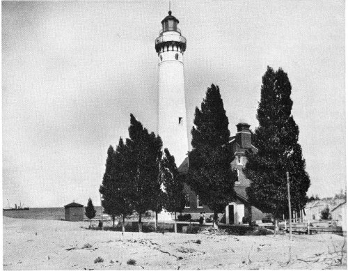 The new structure was 170 feet in height and the lantern was equipped with a first-order lens, the lamp having five concentric wicks. A steam siren fog signal was also established. An incandescent oil-vapor lamp, burning kerosene vapor, replaced the wick lamp in 1912. This increased the intrinsic brilliancy, but decreased the area lit. The candlepower, however, was increased from 6,000 to 87 22,000. The candlepower has now been increased to 80,000 for the white light, with 16,000-candlepower red sector covering the shoals outside the cape and the middle ground inside the bay. The light is 164 feet above water and visible 19 miles. This station is also equipped with a diaphone fog signal and a radiobeacon. (1) (2)