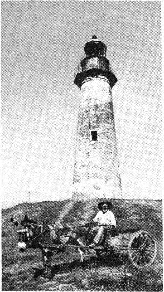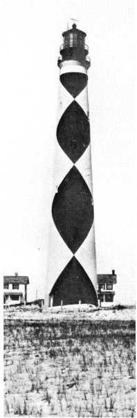 The 1854 report of the Lighthouse Board indicated that at Ocracoke Island a fourth-order Fresnel fixed white light was substituted for the old reflecting illuminating apparatus. In 1857 the Board reported “The Ocracoke channel light vessel and the Beacon Island lighthouse, at the same place have, several times, been reported by this Board as useless and their discontinuance recommended. * * * The erection of a small beacon light at the Ocracoke main light station, to serve as a range light, at a cost, if authorized, of not over $750, and to form a part of the present light station at Ocracoke, will fully subserve the wants of the present and prospective navigation of that inlet much better than by keeping up the Ocracoke Channel and Nine Feet Shoal light vessel, and Beacon Island lighthouse, at an annual saving of between $5,000 and $10,000.” Congress appropriated the $750 for the beacon range light on Ocracoke Island on March 3, 1859, “provided that the lighthouse on Beacon Island and Ocracoke Light vessel be discontinued after the erection and exhibition of the aforesaid beacon light.” In 1862 the Beacon Island light tower was still standing but the lens had been removed. Meanwhile new Franklin lamps had been substituted for valve lamps in the Ocracoke Lighthouse. In 1899 new model fourth-order lamps were supplied. The present white tower, on Ocracoke Island built in 1823, stands 76 feet above the ground and 75 feet above water and the 8,000-candlepower, fourth-order fixed white electric light is visible for 14 miles. (1) (2)