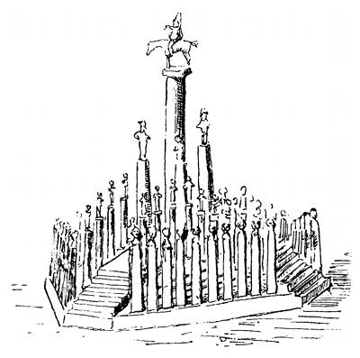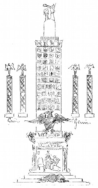 Il n. 7 ci disegna dunque una colonna, che quì appresso riproduciamo. Secondo il concetto dell'autore, rappresenta l'unità della patria[10]. Gli stemmi di tutte le città italiane ne rivèstono il càndido [55] fusto dorati e colorati e sono incatenati ciascuno con tre anelli (Concordia, Amore e Prudenza). Lo zòccolo è di marmo rosso, come la balaustrata; il capitello è verde. Su i quattro gradini del piedistallo, sei leoni di marmo giallo da 1400 libre l'uno, non un'oncia di più nè di meno.