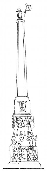 Ed ecco come questo Potere è filosoficamente inteso dal sig. Cànfora. Innalzata una colonna a quattro faccie, su ciascuna delle quali un orologio segna le ore fisse dell'entrata di Vittorio Emanuele nei quattro stati principali[12], egli impone su di essa un tamburo di guerra che sostiene, a sua [91] volta, il globo da cui si eleva la figura geometrica (?) e la stella d'Italia.