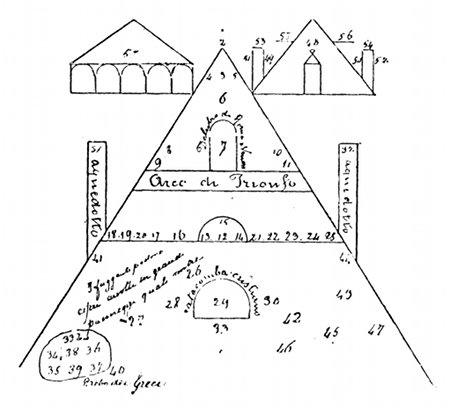 [59] Per la forza delle allegorìe, il n. 7 è però vinto dal n. 142 — ossìa dal sig. Luigi Gatteschi, il quale ha fatto un grosso arco di cartapesta e di trionfo, guidato dai seguenti concetti: