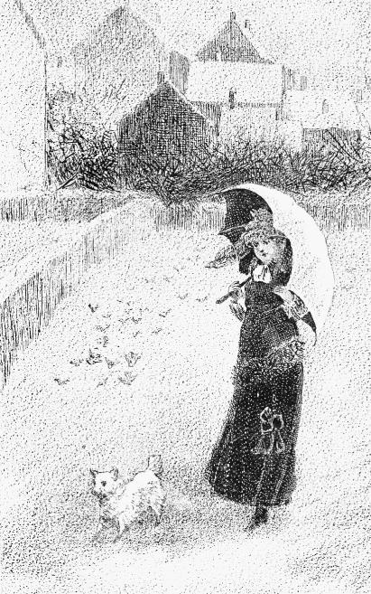 And turning a deaf ear to the landlord’s remonstrances and prophesies of evil, he sets forth briskly on the road, well-known to him although untrodden for two long years. “Dear little soul,” he is saying to himself as he strides through the snow, “what a[103] surprise it’ll be to her! I am half sorry now I did not write—perhaps she’ll be startled—but I don’t believe in sudden joy hurting anyone. I wonder if she’ll be altered—I hope not—the little face couldn’t be sweeter than it was. And Herbert Chetwynd is a rare good fellow—what a welcome I shall get from him and his kindhearted wife—it’s almost worth toiling and broiling for two years in India to come home for such a Christmas. I wonder if that jolly pickle Bertie is much grown! Capital little companion he used to be I remember. How far have I come? Oh! just past the second milestone—the snow is getting plaguy deep and I can hardly see ten yards ahead—I can’t say it is pleasant travelling—how I shall appreciate the splendid fire in the big hall fire-place at Edenhurst. They will be burning the Yule-log for Christmas. How I shall enjoy taking up all the old home customs once more. I wonder if the Waits go round now? What a brute I used to feel, lying snug in bed and listening to the poor little shivering mortals singing outside in the frosty morning air, almost before it was light[104]—but I believe Herbert’s wife and Milly always took care that they had a warm breakfast and a toast at the kitchen fire afterwards—but hulloa! I say, what little dog are you, out alone in the snow in this lonely part of the road? Lost your master, have you, poor little beggar? Never mind—you had better follow me home to Edenhurst for to-night—they wouldn’t refuse a welcome even to a stray dog on Christmas Eve. I say, you are very pressing in your attentions my friend—I’m afraid you are on a wrong tack, sniffing and prancing around me—I’m not your master nor have I the honor of that gentleman’s acquaintance, unless—by Jove, if it isn’t little Nettle—the dog I gave Mildred when I went to India. What can she be doing out here alone? And what does she want me to do I wonder?” as the terrier, delighted at the sudden recognition dances round him more energetically than ever, catches his hand and the skirts of his coat gently in her teeth, then runs on a little way ahead, looking back to see if he is following. “Lead on—I’ll follow thee—that seems to be what you want me to say, eh, little Nettle?[105] All right there!” and the traveller’s two long legs contrive to make quite as rapid progress along the road as the terrier’s four short ones especially as the poor little animal occasionally lights on a snowy heap softer and deeper than the rest and is nearly lost to sight altogether for some seconds.