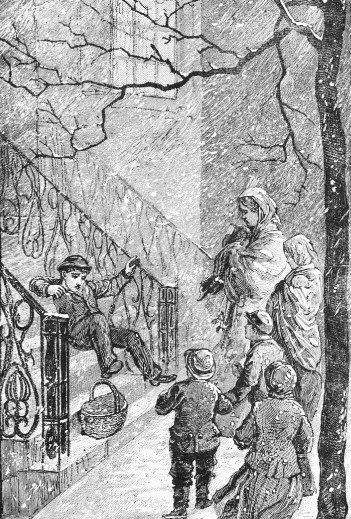 “Belle, I was in despair. It was late; I was on Dwight street, and I led them to Shawmut avenue and tried to explain. Belle, they did not know one word of English except ‘East Canton street.’ They kept saying, ‘East Canton street,’ as a dog says ‘Bow-wow.’ I looked for an officer and could not find one. It snowed harder and harder. I was coward enough to think of shirking. But then I said, ‘Lie and cheat on Christmas eve, that you may lug home your Christmas presents; that is too mean.’ And I said very loud, ‘Kom hier.’ I guess that’s good German any way. And I dragged them to their old 723 East Canton street. It is a mile if it is an inch. I climbed up the snowy steps to read the number. But I slipped as I came down, and knocked my own basket off the step where it stood. That is how mamma’s coffee-pot came broken, I suppose; but all looked so steady in the basket that I never thought of it then. That’s how I came late to supper. But, Belle, don’t you ever tell mamma as long as you live.”