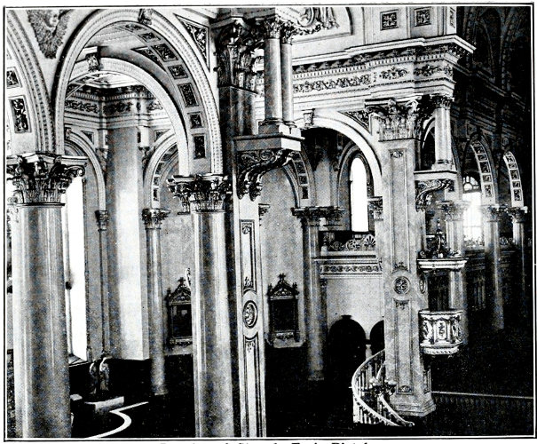 Of her cathedral spire triumphant soars,