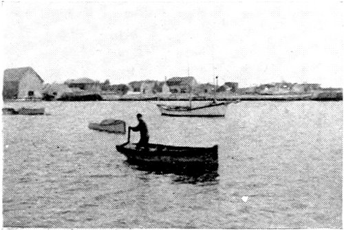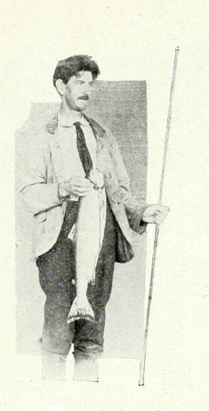 “I stood up and threw out a herring. In a moment it was grabbed. Then the baited hook went over, was seized in a trice, and once more we had a fish. This second fellow was even more lively than the first, and his rushing and jumping was something wonderful to witness. He began pulling us off at once. To make his speed less we crossed our oars and held back water, which acted like a drag. Suddenly like the other, he turned at right angles and led us off in the new direction, fully ten minutes. Then he headed for the boats—mischief in his eye. We were now threatened with mishap worse than before, for the boats were by this time deeply loaded. What was to be done? He made another leap at this juncture, falling more clumsily than before. He was weakening! The men in the boats were now gesticulating and yelling for us to set him free. But we were growing hopeful as the speed of the boat grew perceptibly less. Soon we were able to gather in line to within a few fathoms of him. Within 150 yards of the boats he stopped short. We hauled up. What a beauty! Ten feet long, and weighing over 600 pounds. Three cheers were given as with a rope through his gills we towed him to the beach. We gave him to the men whose herrings we had spilled. Surely a royal sport. The equal of any fishing on the Pacific Coast.”