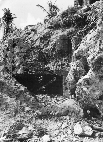 When the Marines landed, they found an excellent but undermanned Japanese trench system on the beaches, and while the pre-landing bombardment had driven enemy defenders back into their holes, they nonetheless were able to pour heavy machine gun and mortar fire down on the invaders. Pre-landing planning called for the Marine amtracs to drive 1,000 yards inland before discharging their embarked Marines, but this tactic failed because of a heavily mined beachhead, with its antitank ditches and other obstacles. However, the brigade attack ashore was so heavy, with overwhelming force the Marines were able to break through, and by 1034, the assault forces were 1,000 yards inland, and the 4th Marines’ reserve battalion had landed. After receiving extremely heavy fire from all emplaced Japanese forces, the Marines worked on cleaning out bypassed bunkers together with the now-landed tanks. By 1330, the Gaan Point blockhouse had been eliminated by taking the position from the rear and blasting the surprised enemy gunners before they could offer effective resistance. At this time also, the brigade command group was on the beach and General Shepherd had opened his command post.