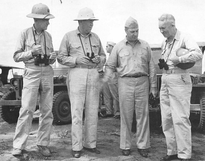 Fleet Marine Force, Pacific commander LtGen Holland M. Smith, right, stands with the leaders of the successful retaking of Orote Peninsula. From left to right, LtCol Alan Shapley; BGen Lemuel C. Shepherd, Jr.; and Col Merlin F. Schneider.