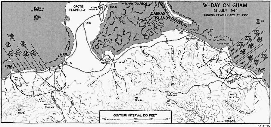 At 0730 a flare was shot in the air above the waiting flotilla and Admiral Conolly commanded: “Land the Landing Force.” At 0808, the first wave of the 3d Marine Division broke the circle of waiting LVTs to form a line and cross the 2,000 yards of water to the 2,500-yard-wide beach between Asan and Adelup points. At 0829, the first elements of the 3d Marine Division were on Guam. Three minutes later, 0832, lead assault troops of the 1st Provisional Marine Brigade crossed the shelled-pocked strand at Agat, six miles south of the Asan-Adelup beachhead.