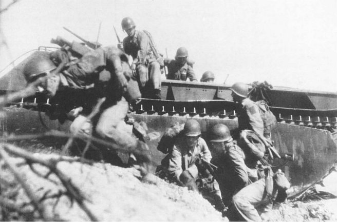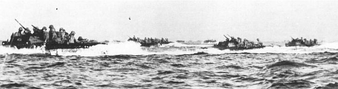 Upon reaching the beach, Marines quickly unload over the gunwales of the amtrac which brought them in and rushed off the beaches. As the frontlines advanced, succeeding waves of amphibian tractors will carry the troops further inland.