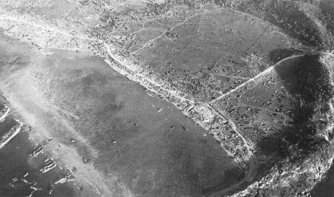 This Japanese airstrip on Orote Peninsula was one of the prime objectives of the 1st Provisional Marine Brigade in its zone. Pockmarks on the strip resulted from the aerial, ships’ gunfire, and artillery bombardments directed at this target.