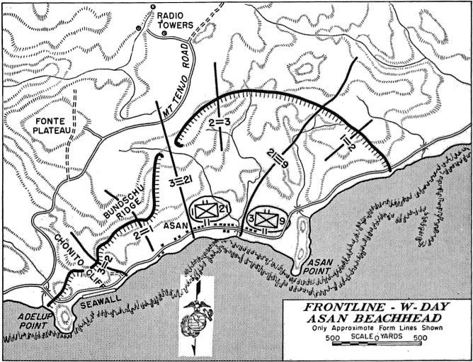 The 3d Marines under Colonel W. Carvel Hall struck on the far left of the 2,500-yard beachhead, the left flank of the division near Adelup Point. Ahead was Chonito Cliff, a ridge later named Bundschu Ridge, and high, difficult ground in back of which was the final beachhead line (FBHL), or first goal of the landing. The center, straight up the middle, belonged to the 21st Marines, under Colonel Arthur H. “Tex” Butler. The regiment would drive inland, secure a line of cliffs, and defend them until the division caught up and was ready to expand the beachhead outward. Under Colonel Edward A. Craig, the 9th Marines landed on the right flank near Asan Point, ready to strike inland over paddies to and across lower and more hospitable hills, but all part of the same formidable enemy-held ridgeline.