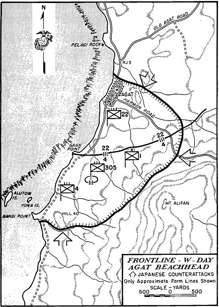 The Japanese Agat command had prepared its defenses well with thick-walled bunkers and smaller pillboxes. The 75mm guns on Gaan Point were in the middle of the landing beaches. Crossfire from Gaan coordinated with the machine guns on nearby tiny Yona island to rake the beaches allocated to the 4th Marines under Lieutenant Colonel Alan Shapley. The 4th Marines was to establish its beachhead, and protect the right or southernmost flank. After bitter fighting, the 4th Marines forged ahead on the low ground to13 its front and cleared Bangi Point where bunker walls could withstand a round from a battleship. Lieutenant Colonel Shapley set up a block on what was to be known as Harmon Road leading down from the mountains to Agat. A lesson well learned in previous operations was that the Japanese would be back in strength and at night.