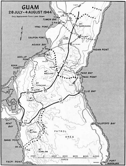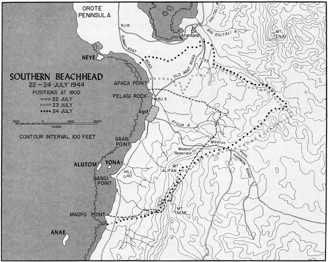 Obata had expected a hasty pursuit, and set up strong rear guards to give time for his retreating forces to organize. Victory was no longer even a hope, but the Japanese could still extract a painful cost. General Geiger, who had a little time now, could give his troops a rest and move into attack positions across the width of the island. Strong and frequent patrols were sent out to find routes cross33 country and glimpse clues of enemy strength and dispositions.